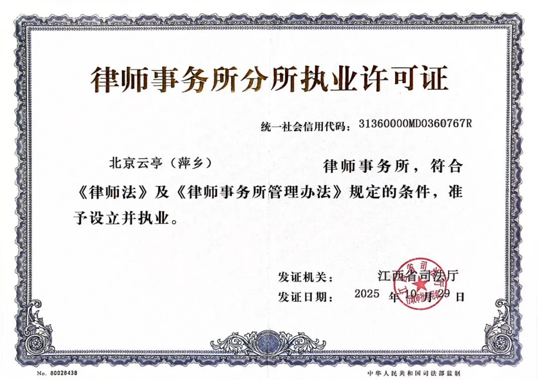 近日,经江西省司法厅审核批准,北京云亭(萍乡)律师事务所(以下简称“云亭萍乡分所”)正式成立,落子萍乡。这是继武汉、乌鲁木齐、徐州、连云港、太原、石家庄、济南等地分所设立后,云亭在拓展法律服务版图中的又一重要节点。此次新分所的设立,增强了云亭在全国范围内提供法律服务的响应速度与覆盖能力。